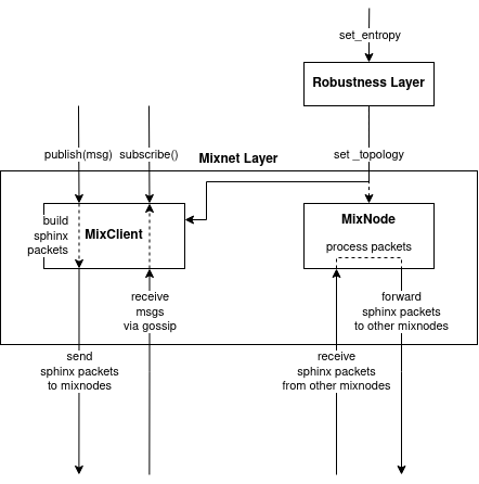 mixnet.py: A public interface of the Mixnet layer, which can be used by upper layersrobustness.py: A public interface of the Robustness layer, which can be on top of the Mixnet layer and used by upper layers