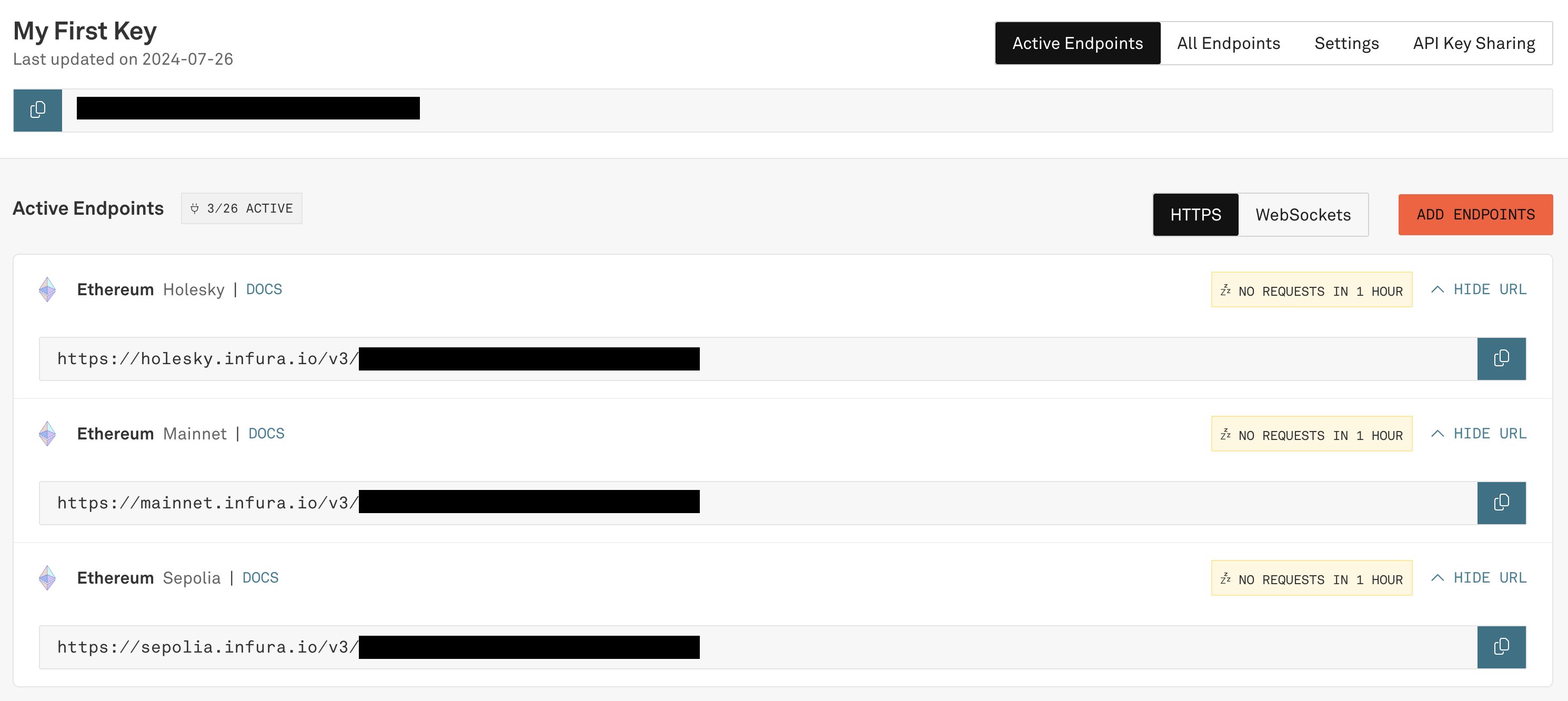 3. You will be presented with a dashboard for your new key. Make sure to have Ethereum Sepolia's checkbox selected in the Networks section.