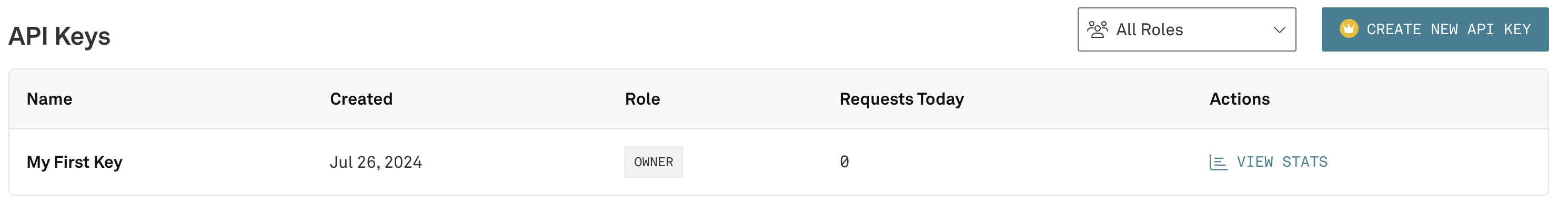 An API Key named "My First Key" should be auto-generated. Click on it, otherwise click on the "Create New API Key" button.