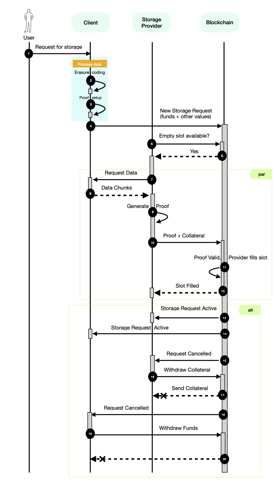 - Requesting storage from the network by sending a storage request to the smart contract.